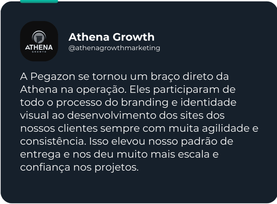 A Pegazon não funciona como um freelancer ou fornecedor pontual. Atuamos como extensão real da sua agência, com processo, padrão visual consistente e gestão de entregas. Você tem previsibilidade, comunicação organizada e qualidade alinhada ao seu posicionamento sem retrabalho e sem surpresas.